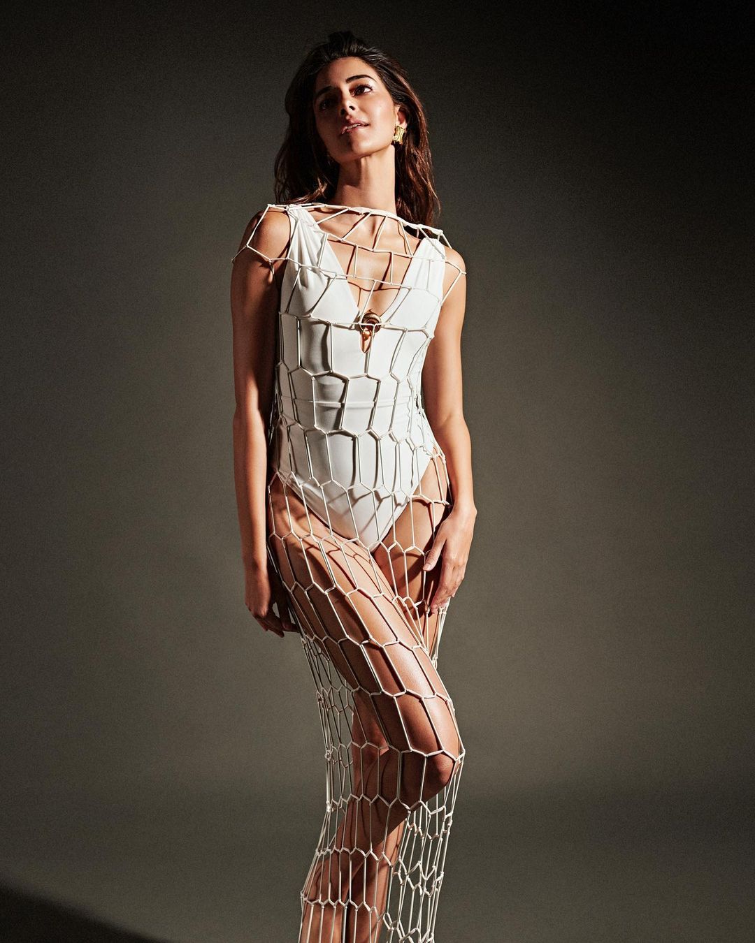 अनन्या पांडेने शेअर केलेल्या फोटोंमध्ये ती व्हाईट कलरच्या मोनोकिमिमध्ये दिसत आहे. मात्र त्यावर अभिनेत्रीनं एक जाळीसुद्धा परिधान केली आहे.