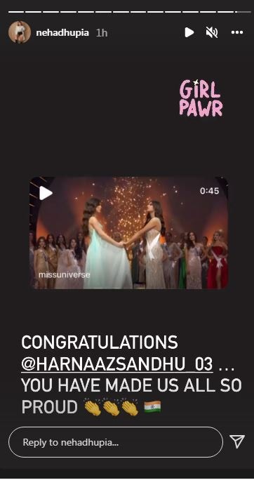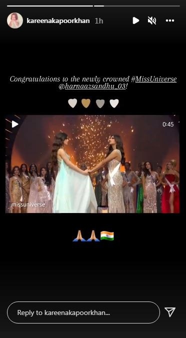 कंगना रणौतनेही तिच्या इन्स्टा स्टोरीवर हरनाझचा स्पर्धेतील फोटो शेअर करत अभिनंदन केले आहे. करिना कपूर, नेह धुपिया यांनी सुद्धा इन्स्टा स्टोरीवरुन हरनाझला शुभेच्छा दिल्या आहेत.