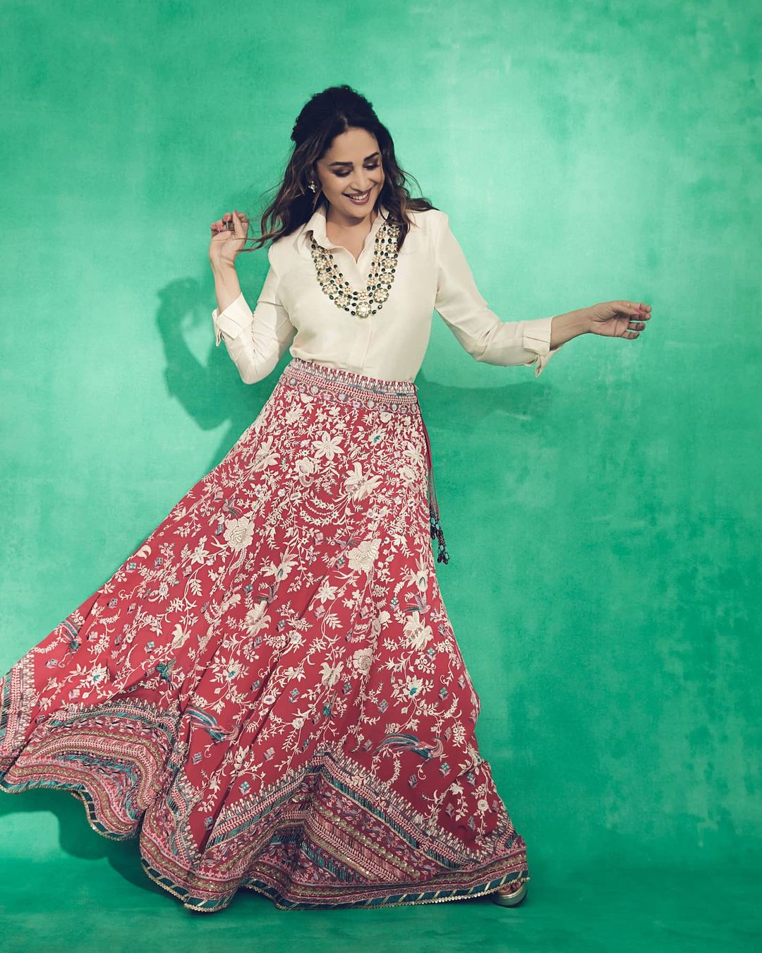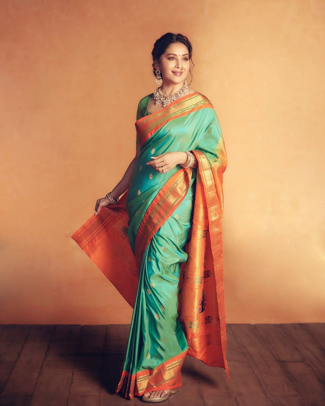 माधुरीने फिकट हिरव्या रंगाची काठपदर साडी नेसली आहे. तसेच नाकात नथसुद्धा घातली आहे. कपाळावर चंद्रकोरसुद्धा आहे. या वेषामध्ये ती अगदी अप्सरा भासत आहे.