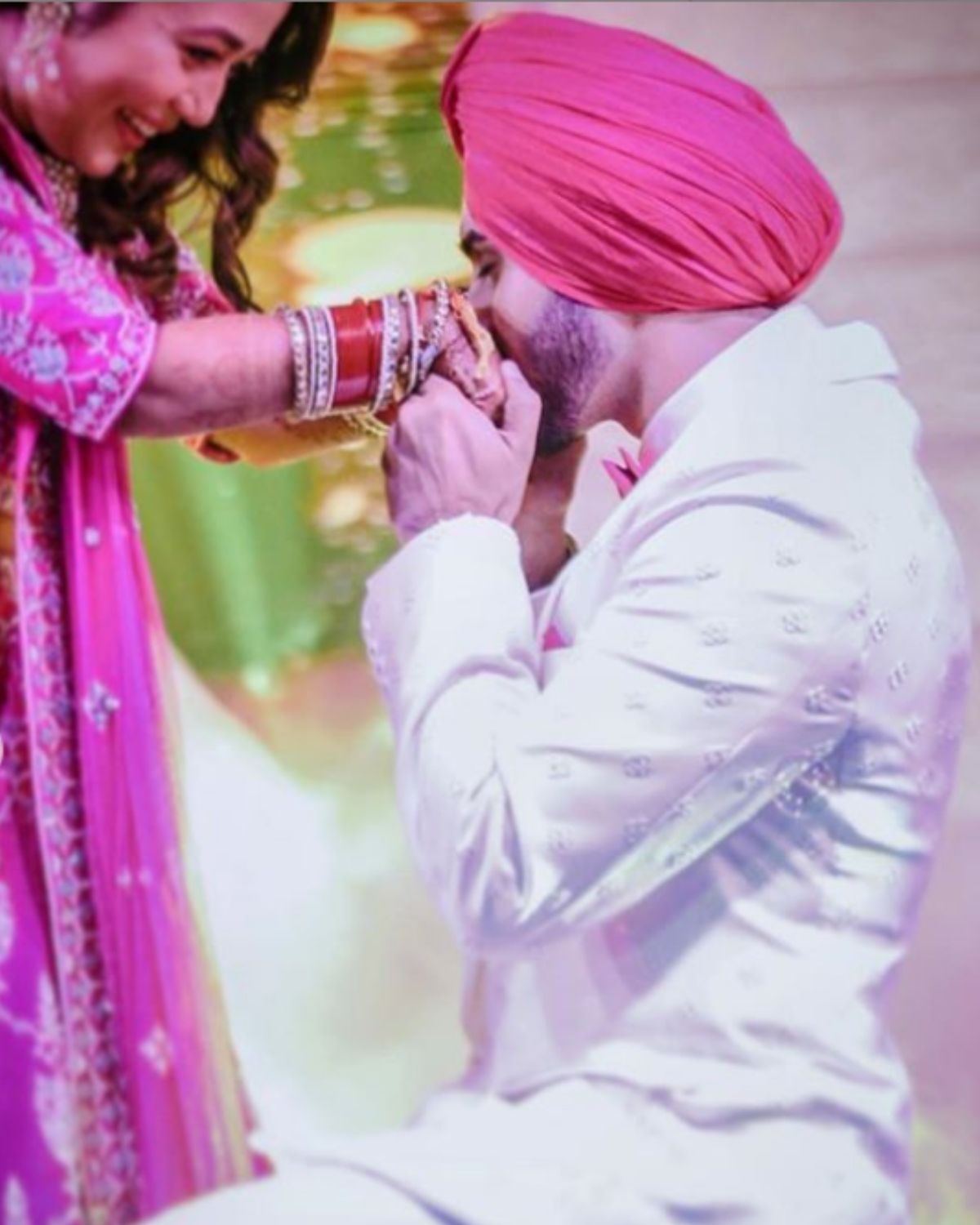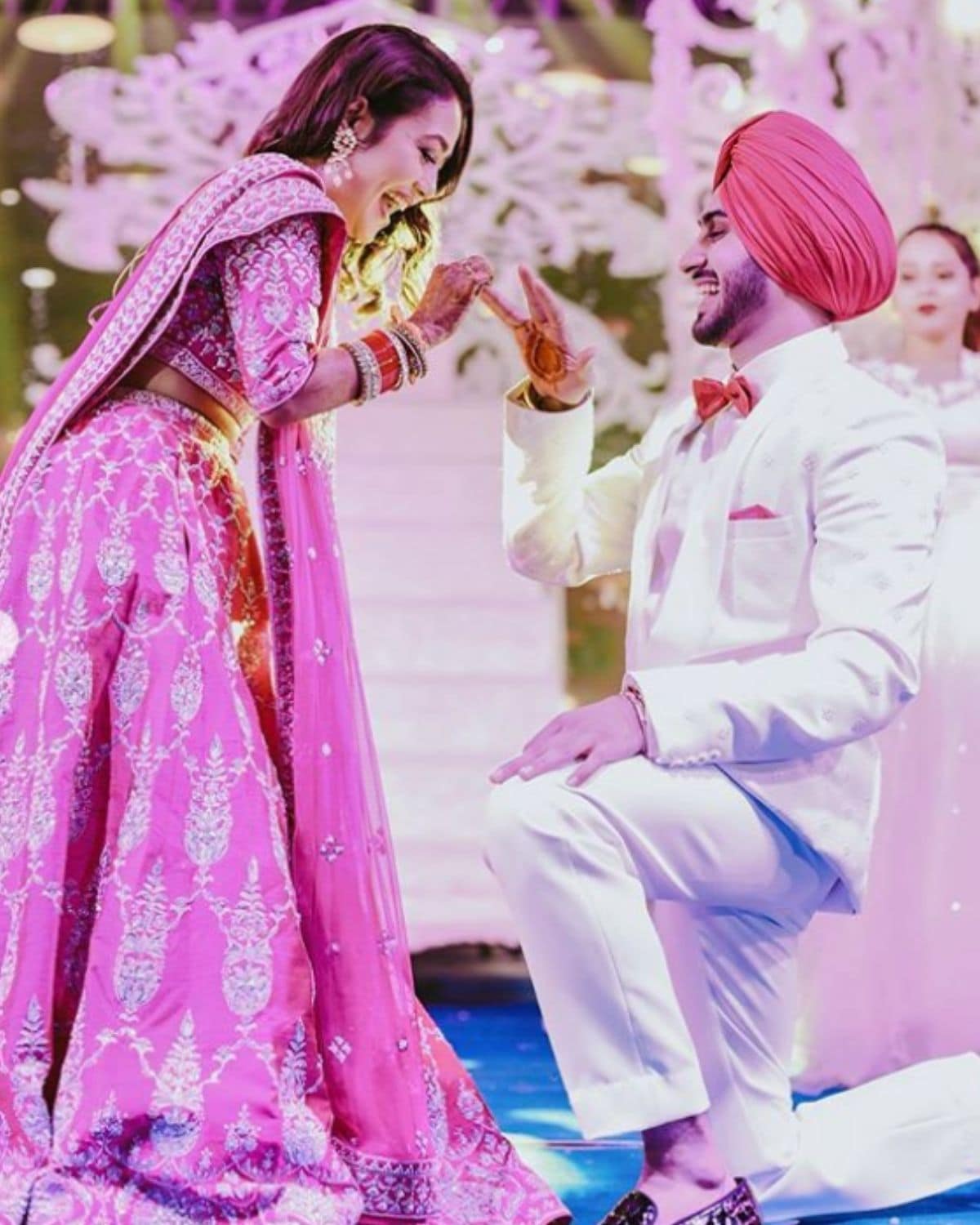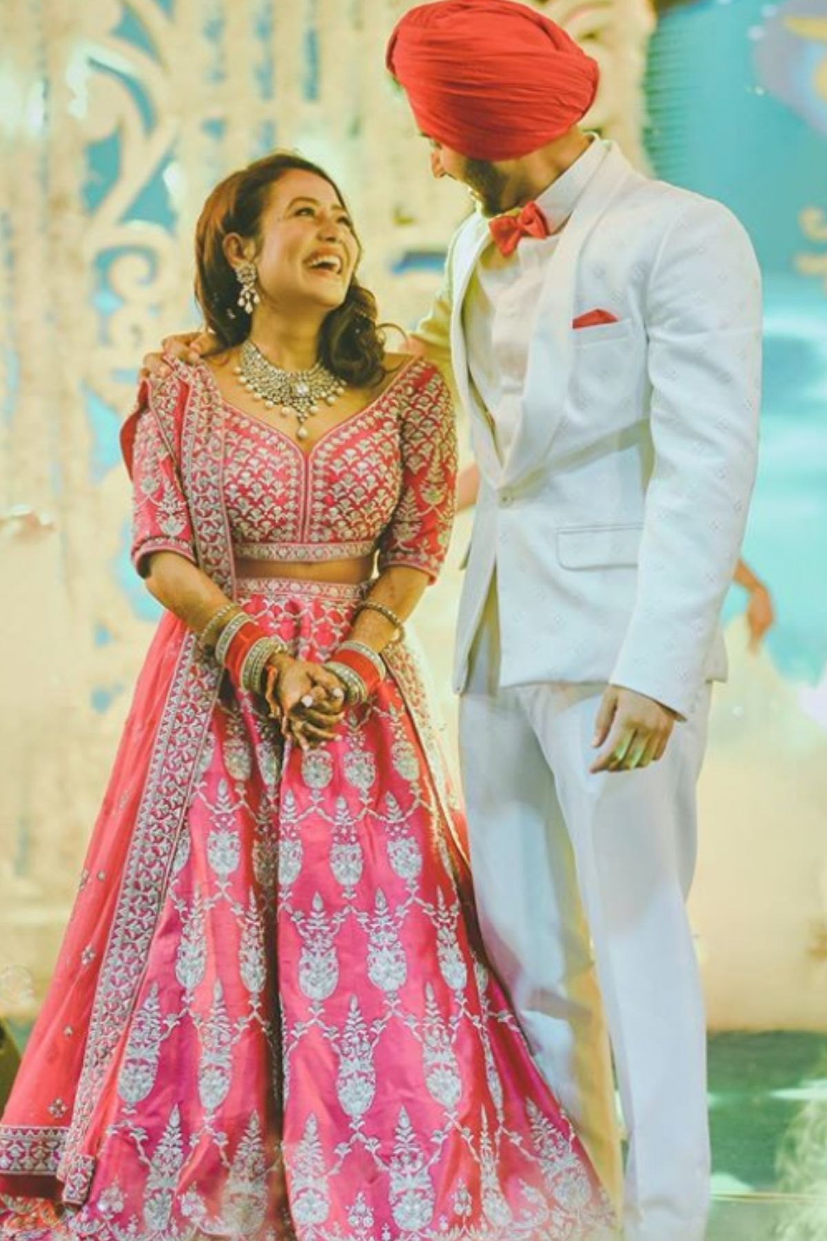पोस्ट वेंडिंग रिसेप्शनवेळी नेहाने पिंक रंगाचा लेहंगा, तर रोहनप्रीत पांढऱ्या रंगाच्या सूटमध्ये दिसतोय. (Photo credit: instagram/@nehakakkar)