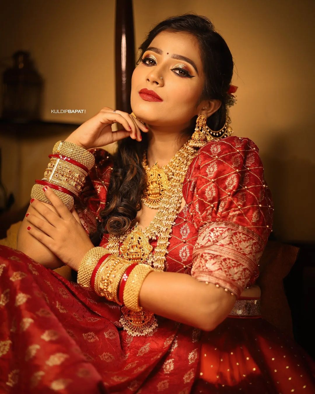 हातात सुंदर तोडे आणि गळ्यात भरगच्च दागिणे यामुळे ती फारच सुंदर दिसत आहे.