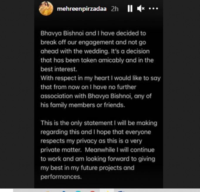 साखरपुडा तोडला मेहरीन पीरजादा (Mehreen Pirzada) हिने मार्च 2021 मध्ये काँग्रेस नेता भव्य बिश्नोईसोबत थाटामाटात साखरपुडा केला होता. याशिवाय लवकरच लग्नबंधनात अडकणार असल्याचंही सांगितलं होतं. मात्र आता तिने साखरपुडा तोडल्याचं चाहत्यांना सांगितलं.