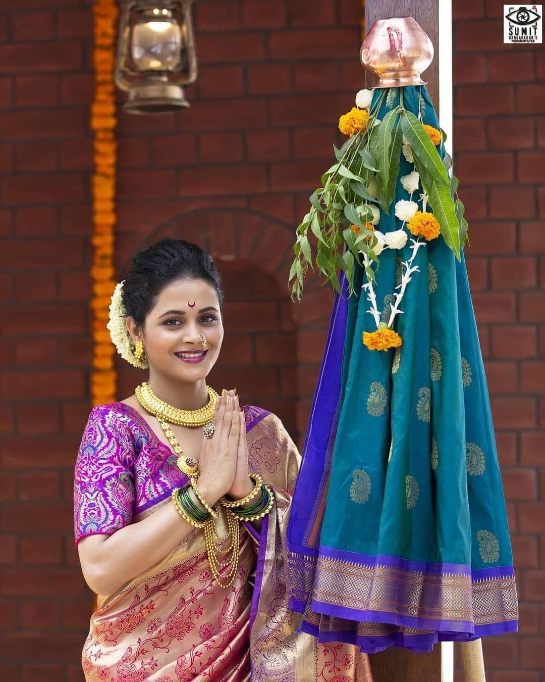 मराठीतील अतिशय फिट आणि सुंदर अभिनेत्री माधवी निमकरनेसुद्धा गुढीपाडवा साजरा केला आहे. साडीमध्ये माधवी अतिशय खुलून दिसत आहे.