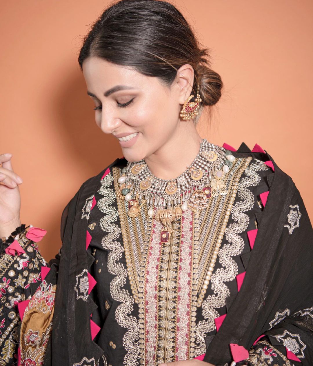 काळ्या रंगाच्या डिझायनर प्लाजो सुट वर हिनाने सुंदर ओढणी परिधान केली आहे. त्यामुळे तिचा लूक अतिशय सुंदर दिसत आहे.