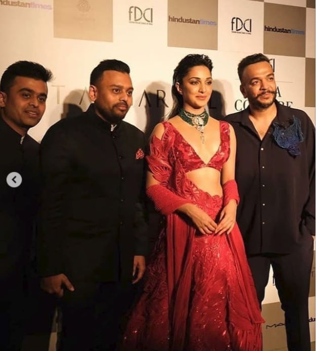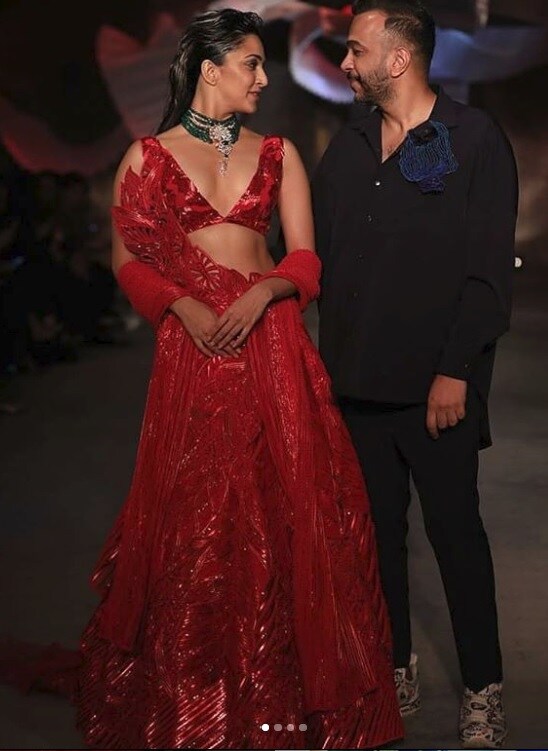 अमित अग्रवालच्या या शोसाठी कियारा शो स्टॉपर म्हणून उतरली. यावेळी तिनं लाल रंगाचा लेहंगा घातला होता आणि कॉन्ट्रास ग्रीन ज्वेलरीच्या सहाय्यानं तिनं लुक कंप्लिट केला होता.