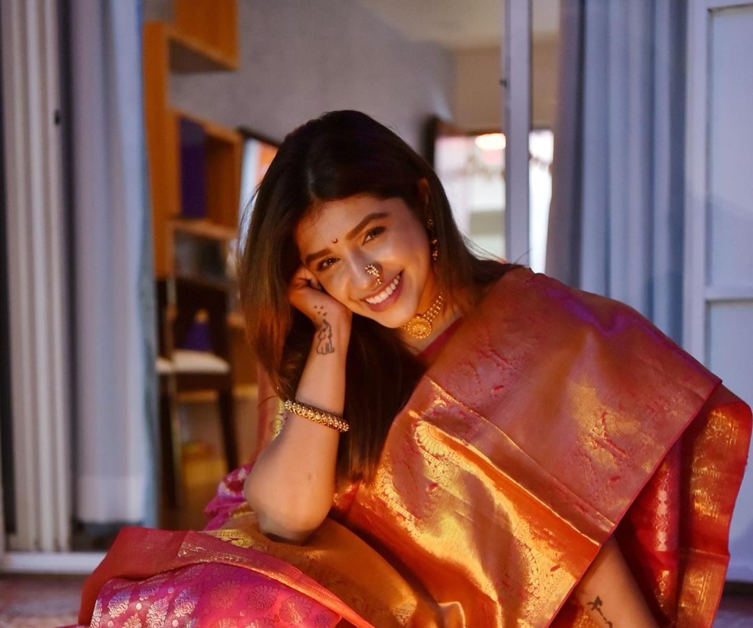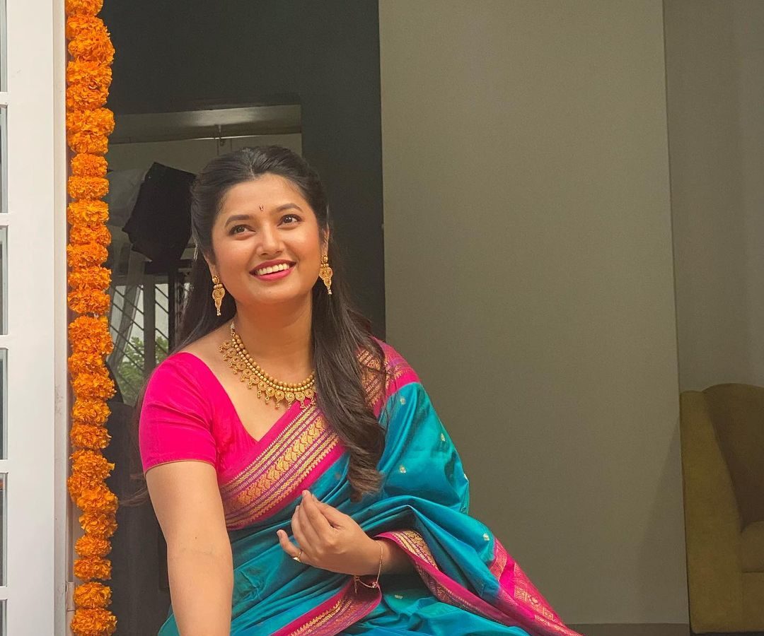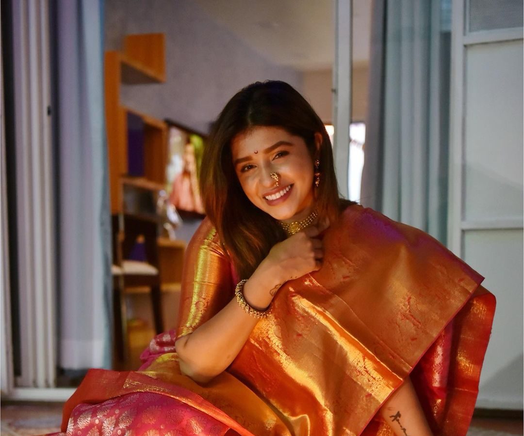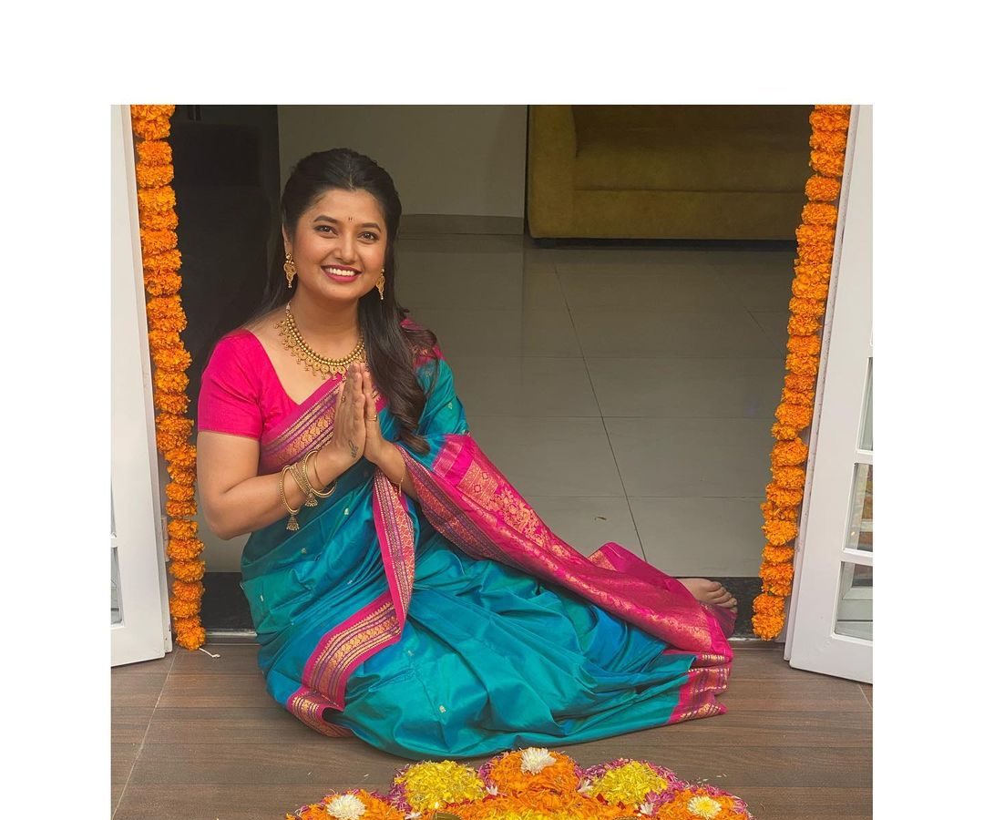तेजश्री प्रधानने खास नववारी लूक शेअर केला आहे.यामध्ये तिन पैठणी नेसली आहे.