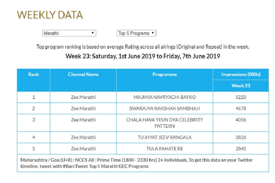 पुन्हा एकदा माझ्या नवऱ्याची बायको ही मालिका टीआरपीच्या शर्यतीत पहिल्या स्थानावरच आहे. शनाया, राधिका आणि गुरू यांची केमिस्ट्री दर एपिसोडला खुलत चालली असून प्रेक्षकांनाही या मालिकेतले ट्विस्ट आवडत आहेत. ५२२० पॉईंटने ही मालिका पहिल्या स्थानावर आहे.