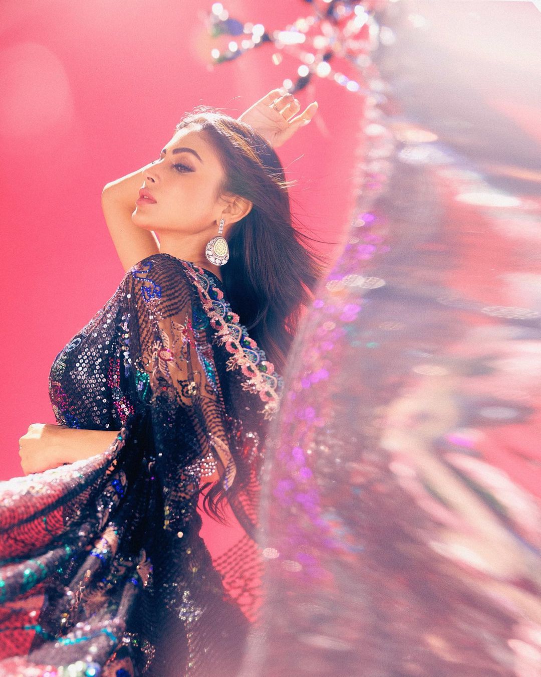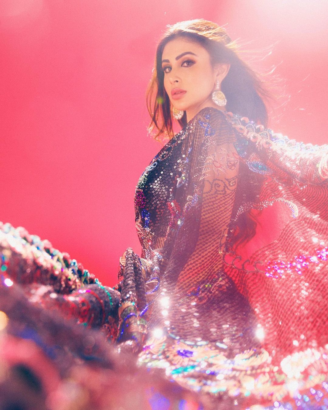 फोटोमध्ये मौनी रॉयने मल्टी कलर सीक्वन्ड साडी नेसली आहे. या फोटोंमध्ये मौनी रॉय वेगवेगळ्या पोज देताना दिसत आहे. (फोटो क्रेडिट: imouniroy/instagram)