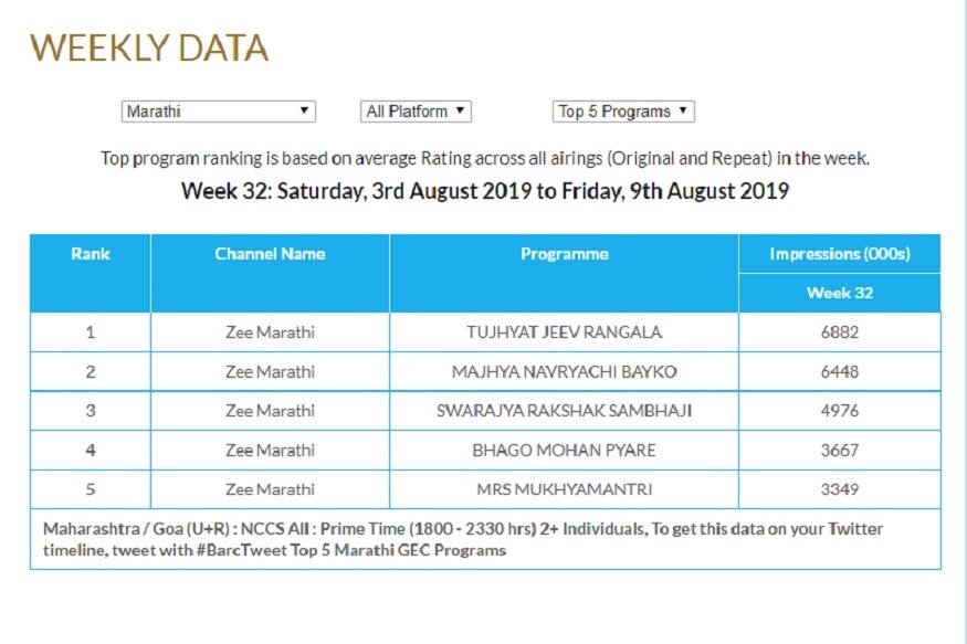 या वेळीही टीआरपी रेटिंगमध्ये पुन्हा एकदा झी मराठीच आहे. स्टार प्रवाह, कलर्स मराठी यांनी पहिल्या पाचात नंबर पटकावला नाहीये.