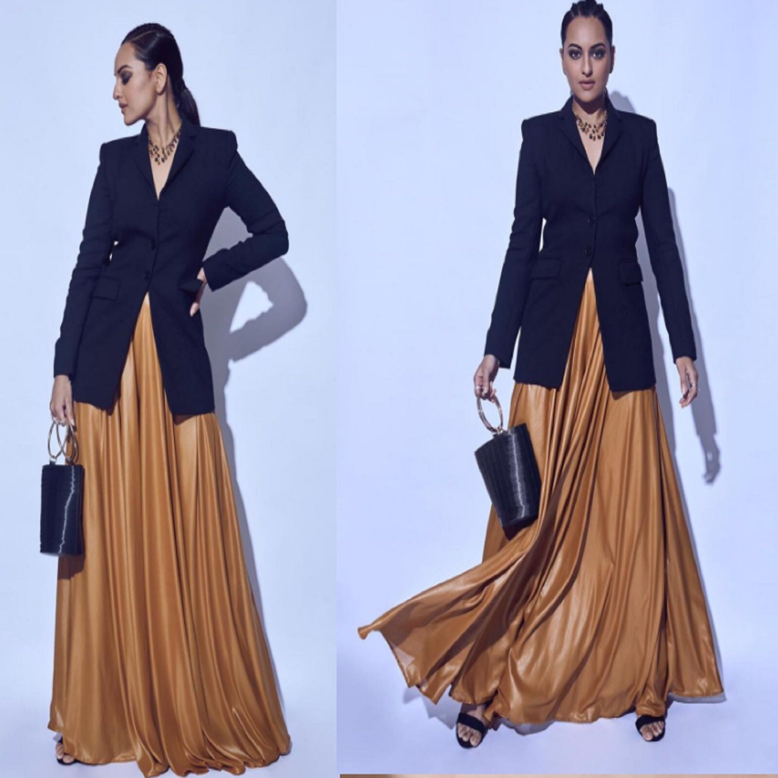 बॉलिवूडची दबंग गर्ल म्हणून अभिनेत्री सोनाक्षी सिन्हाला ओळखलं जातं. सोनाक्षीसुद्धा बऱ्याचवेळी अतरंगी लुक्समध्ये दिसून येते. सुंदर ड्रेसवर ब्लॅक ब्लेझर फक्त सोनाक्षीच घालू शकते.