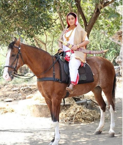 या ऐतिहासिक लुकमध्ये ती फारच सुंदर दिसत आहे. फोटोमध्ये अभिनेत्रीने पांढऱ्या रंगाची नऊवारी साडी नेसली आहे. हातात तलवार घेऊन ती अश्वारूढ आहे.