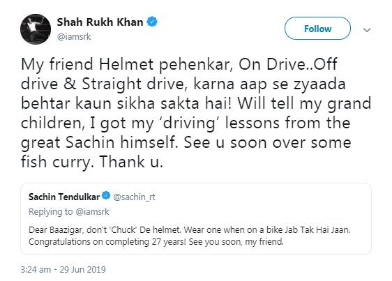 शाहरुखनेही सचिनच्या या ट्वीटला उत्तर देत म्हटलं की, ‘माझ्या मित्रा, हेल्मेट वापरून ऑन ड्राइव्ह.. ऑफ ड्राइव्ह आणि स्ट्रेट ड्राइव्ह करणं तुझ्यापेक्षा चांगलं कोण शिकवू शकतं. मी माझ्या नातवंडांना सांगेन की मला ‘ड्रायविंग’ स्वतः महान सचिनने शिकवली आहे. फिश करी खायला लवकरच आपण भेटू. धन्यवाद.’  जर टीम इंडियाने जिंकला वर्ल्ड कप, तर विराटला बॉलिवूडकडून मिळेल सर्वात मोठी भेट