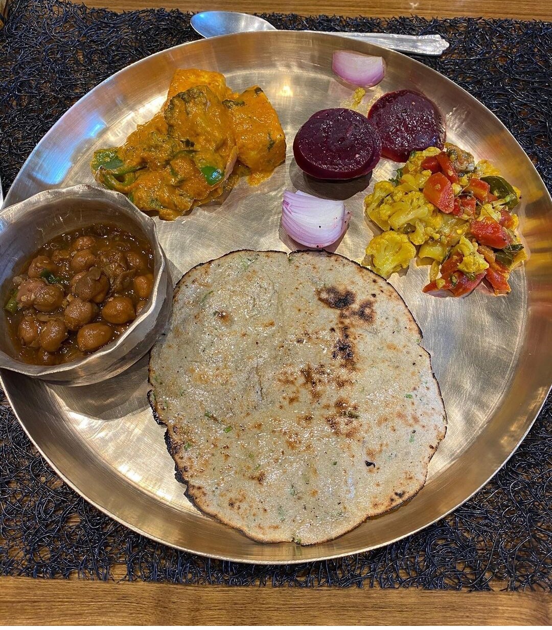 शिल्पा शेट्टीने शेअर केलेल्या फोटोमध्ये तिच्या ताटात छोले, गाजर,फ्लॉवर यांची मिक्स भाजी, तसेच शिमला मिरची आणि पनीरची मिक्स भाजी, सॅलडमध्ये बिट आणि कांद्याचे काप, सोबतच एक मिक्स पिठाची भाकरी दिसून येत आहे.