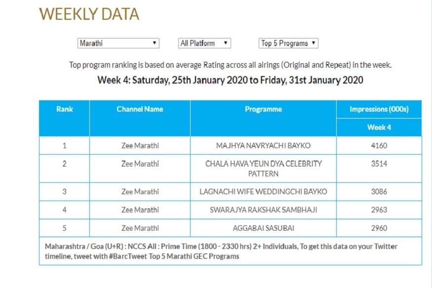 मागच्या आठवड्याप्रमाणे या आठवड्यातही TPR लिस्टमध्ये Zee Marathi च्या मालिकांनीच बाजी मारली आहे. टॉप 5 मध्ये सर्व मालिका या Zee मराठीच्या आहेत.