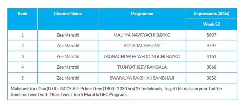 वेगवेगळ्या ट्वीस्ट आणि टर्न्ससोबत वर्षाच्या शेवटी अग्गंबाई सासूबाई या मालिकेनं बाजी मारली. ही मालिका टीआरपी लिस्टमध्ये दुसऱ्या स्थानावर आहे.