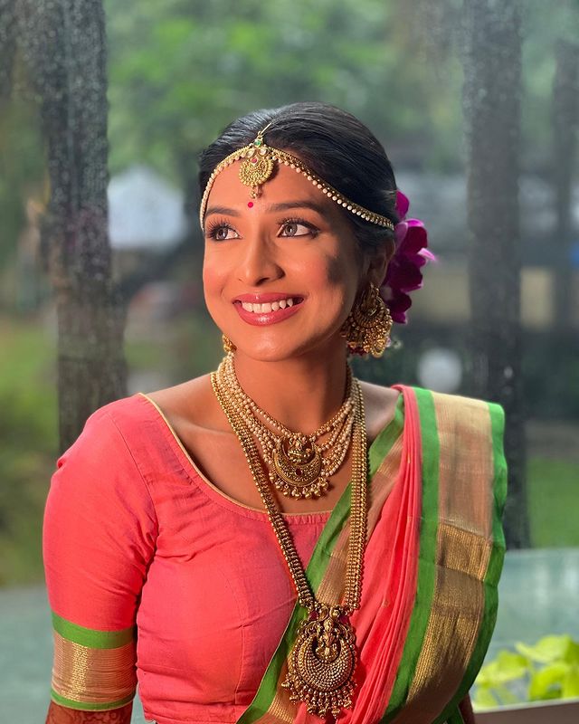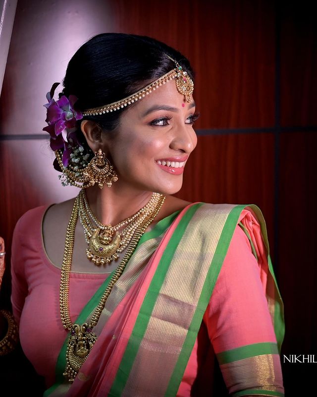 पिंक साडी विथ साऊथ इंडियन दागिन्यांमध्ये अमृता फारचं सुंदर दिसली. त्याचप्रमाणे तिनं साडीला थोडासा इंडोवेस्टर्न लुक देण्याचा प्रयत्न केला होता.