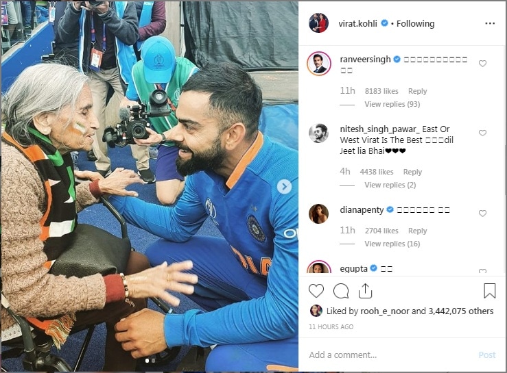 सामना संपल्यानंतर विराटने आजींसोबतचे फोटो शेअर करत म्हटलं की, ‘एवढ्या प्रेमासाठी आणि पाठिंब्यासाठी सगळ्या चाहत्यांचे त्यातही खासकरून चारुलता पटेल यांचे आभार. चारुलता यांचं वय ८७ वर्ष आहे आणि मी त्यांच्यापेक्षा जास्त पॅशनेट आणि क्रिकेटप्रेमी चाहता आजपर्यंत पाहिला नाही.’