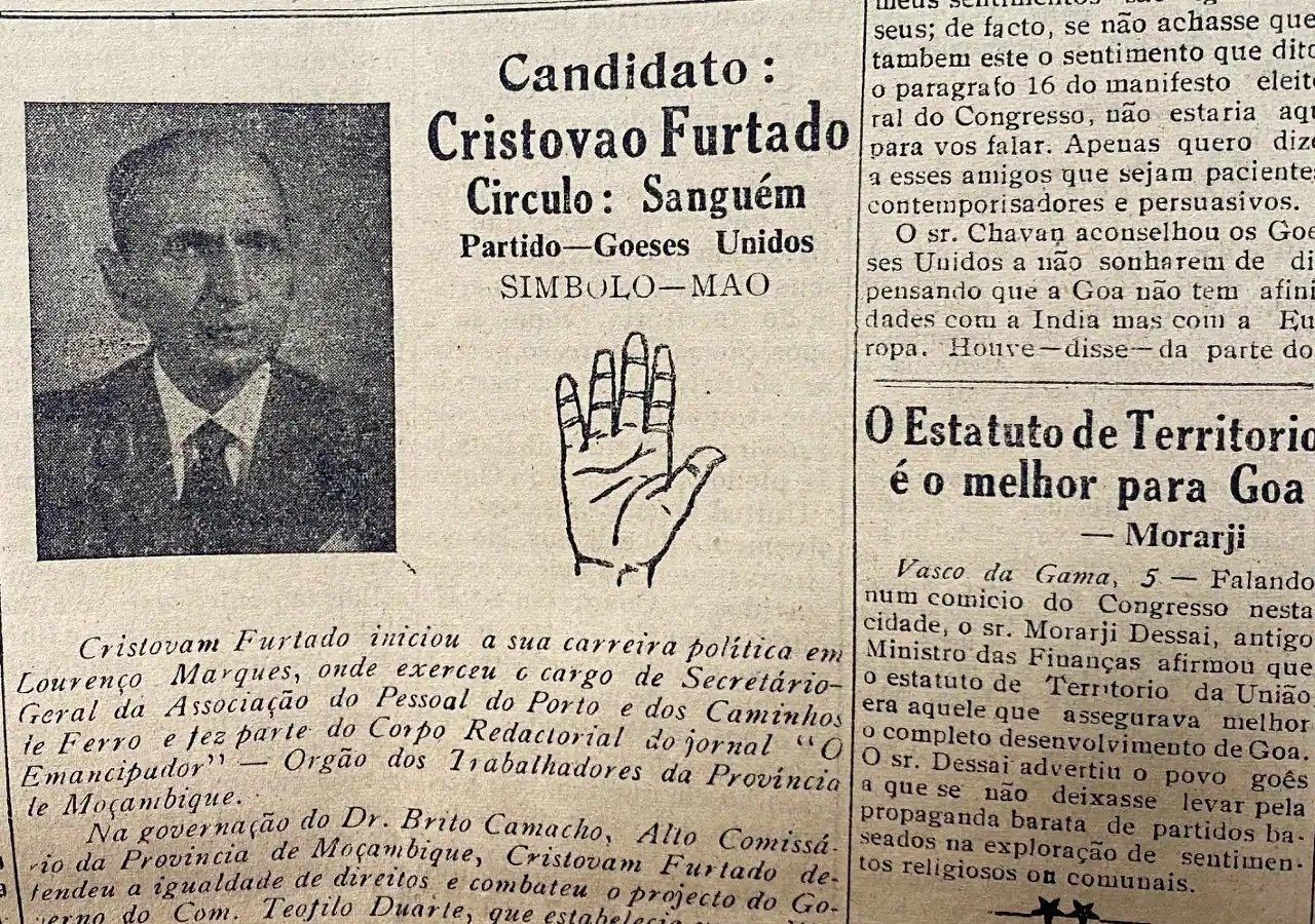 युनायटेड गोवान पार्टीच्या क्रिस्टोवाओ फुर्टाडो यांना पाठिंबा देणारी जाहिरात, जे संगेम मतदारसंघातून निवडणूक लढवत होते. त्यांना 1,683 मते मिळाली आणि महाराष्ट्रवादी गोमंतक पक्षाच्या उमेदवाराकडून त्यांचा पराभव झाला. (फोटो - www.centrallibrary.goa.gov.in)