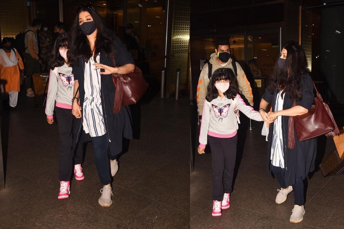 एअरपोर्टवर कॅमेरा बघून ऐश्वर्या आराध्याला प्रोटेक्ट करत होती. (फोटो साभार- विरल भयानी )