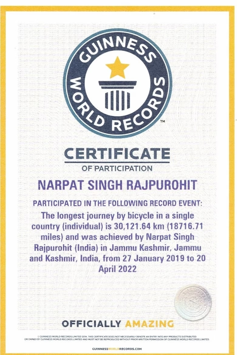 बाडमेर, 13 मार्च : राजस्थानातील बाडमेर जिल्ह्यातील लंगेरा या छोट्याशा गावातील एका तरुणाला पर्यावरण रक्षणाची इतकी ओढ होती की त्याने विश्वविक्रम केला आहे. तसेच हे काम करताना इतका मग्न होता की, त्याने विश्वविक्रम केव्हा केला हे त्यालाच कळले नाही. बाडमेरचे ग्रीनमॅन म्हणून प्रसिद्ध असलेले नरपत सिंग राजपुरोहित, असे त्यांचे नाव आहे. बाडमेरचे ग्रीनमन म्हणून प्रसिद्ध असलेले नरपत सिंग राजपुरोहित यांनी देशातील सर्वात लांब सायकल प्रवास करून विश्वविक्रम केला आणि गिनीज बुक ऑफ वर्ल्ड रेकॉर्डमध्ये आपले नाव नोंदवले. ग्रीनमॅन नरपत सिंग यांनी सायकलने 30121 किलोमीटरचा लांबचा प्रवास केला आहे. ग्रीनमॅन नरपत सिंग राजपुरोहित सांगतात की, त्यांनी 27 जानेवारी 2019 रोजी जम्मू विमानतळावरून प्रवास सुरू केला आणि 20 एप्रिल 2022 रोजी जयपूरमध्ये पूर्ण केला. एकाच देशात सायकलचा सर्वात लांब प्रवास 30,121.64 किमी (18716.71 मैल) आहे. सायकल प्रवासादरम्यान नरपत यांना डोंगराळ भागातून आणि मुसळधार पावसातून चालत जावे लागले. नरपत सिंह म्हणतात की, आज जगात पर्यावरण संरक्षण खूप महत्त्वाचे आहे आणि कोरोनाने आपल्याला हे दाखवून दिले. त्यामुळे गांभीर्याने घेऊन पुढे जायला हवे. या प्रकारच्या प्रवासासाठी एक टीम नेहमी वाहनात सोबत असते, पण त्यांच्याकडे ही सुविधा नव्हती, असेही त्यांनी सांगितले. जिद्दीला सलाम - जगातील सर्वात लांब सायकल प्रवासाला निघालेले बाडमेरचे रहिवासी ग्रीनमन नरपत सिंग राजपुरोहित लंगेरा यांनी 27 जानेवारी 2019 रोजी पर्यावरण संरक्षण आणि जलसंधारण जनजागृतीचा संदेश देण्यासाठी सायकल प्रवासाला सुरुवात केली. त्यांनी 20 राज्ये आणि 6 केंद्रशासित प्रदेशांमध्ये 30121.64 किलोमीटरचे अंतर कापले. या मोहिमेला एकूण 3 वर्षे, 2 महिने आणि 24 दिवस लागले. त्यांचा सायकल प्रवास 1179 दिवसांत 26 राज्यांतील 467 जिल्ह्यांतून गेला. ग्रीनमन नरपत सिंग यांनी विविध राज्यांमध्ये पर्यावरण संरक्षण आणि जलसंवर्धनासाठी जनजागृती मोहीम राबवली होती. एका पायाला 38 टाके पडले आणि 10% अपंगत्व आल्यावरही नरपत सिंग यांनी ध्येय पूर्ण केले.