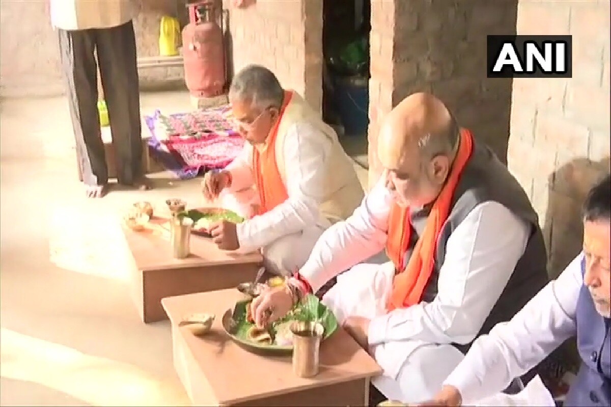 पश्चिम बंगाल निवडणुकीच्या तोंडावर गृहमंत्री आणि भाजपचे चाणक्य अमित शहा यांनी आपल्या दौऱ्यात नारायणपूर गावाला भेट दिली. तिथं एका निर्वासित कुटुंबासोबत त्यांनी जेवण केलं. ( Image - ANI)