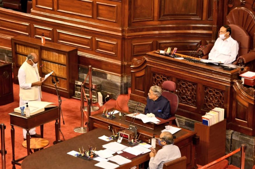 राज्यसभेच्या नवनिर्वाचित खासदारांचा शपथविधी बुधवारी सकाळी झाला. सोशल डिस्टन्सिंग पाळून आणि मास्क लावून खासदार बसले होते.