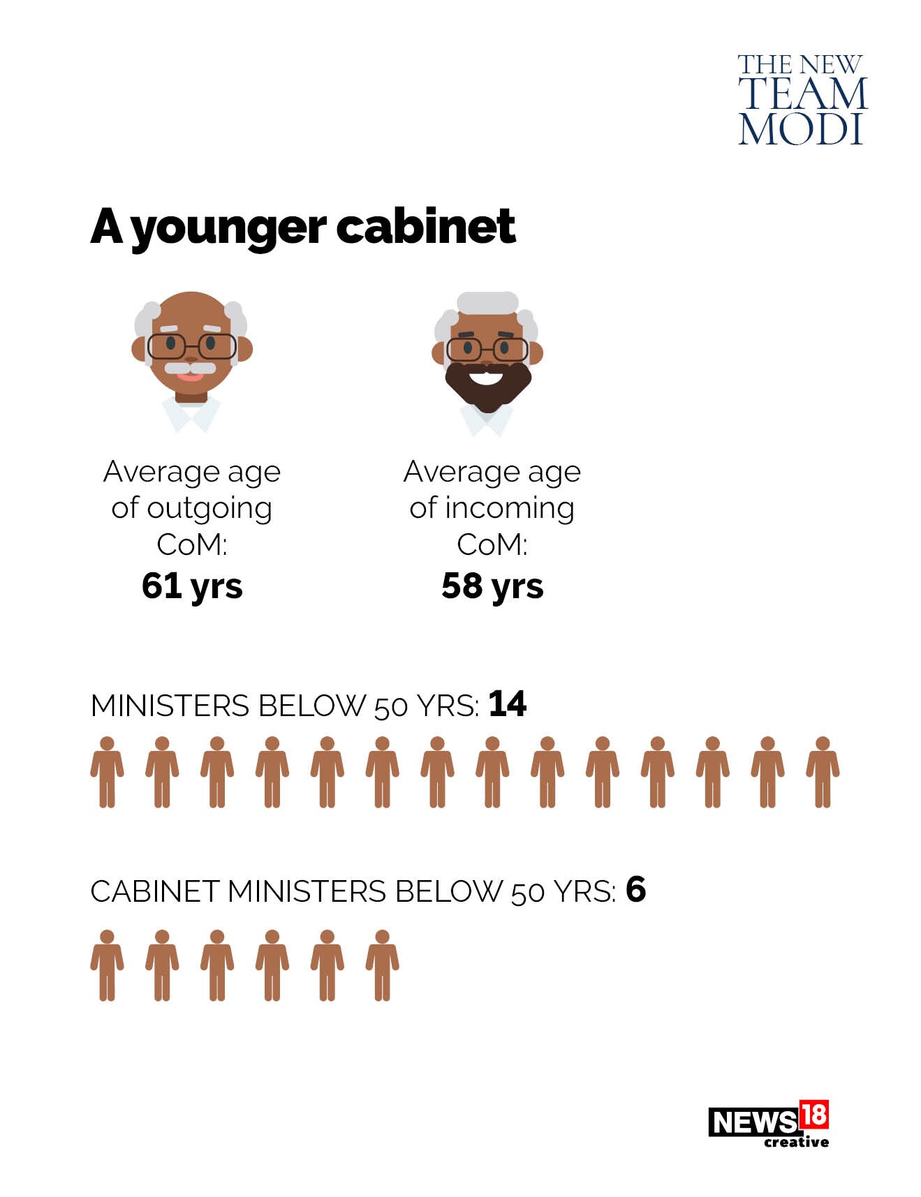 नव्या मंत्रिमंडळाचं वय कमी झालं आहे. यापूर्वी मंत्रिमंडळाचं सरासरी वय 61 वर्षं होतं. तर नव्या चेहऱ्यांचं सरासरी वय 58 वर्षं आहे.