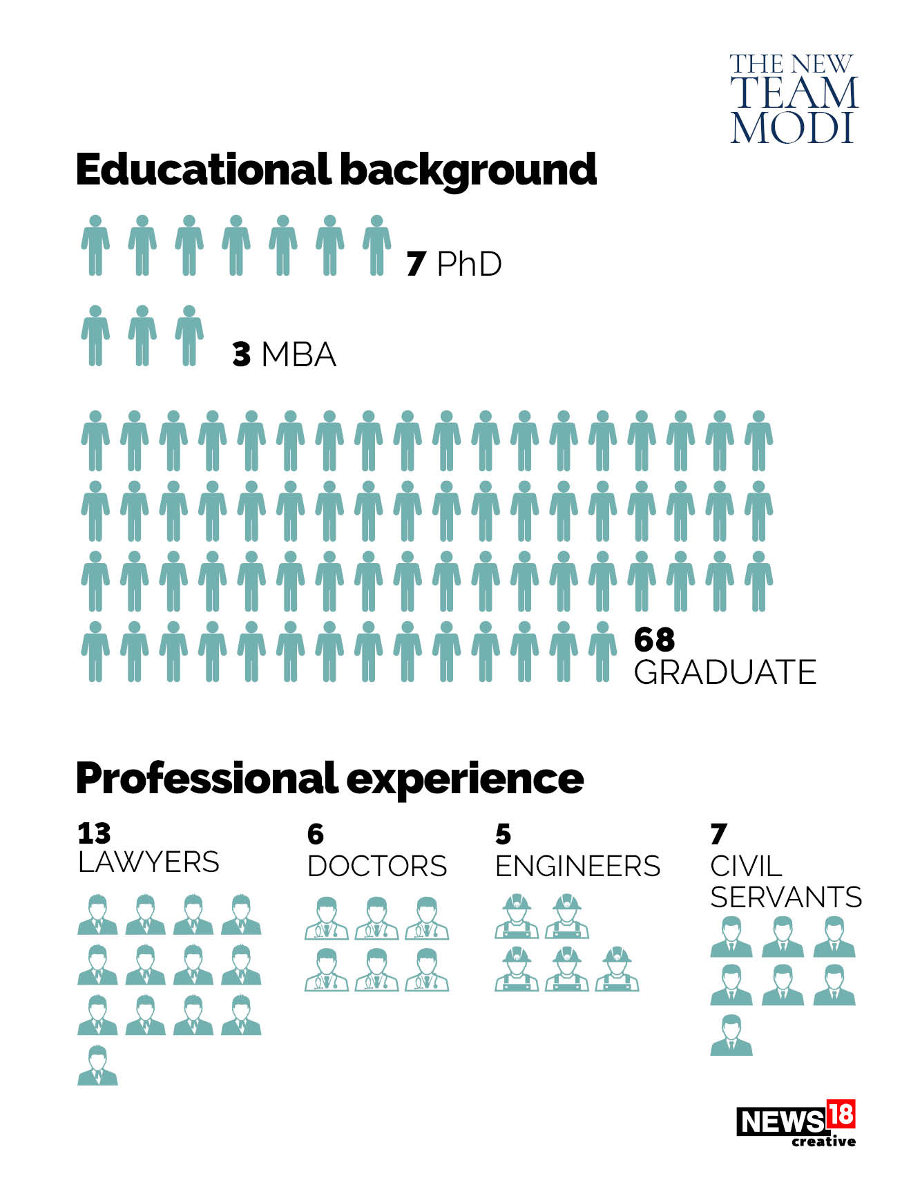 फेरबदलानंतर आता 7 मंत्री डॉक्टरेट मिळवलेले, 3 एमबीए तर 68 मंत्री पदवीधर आहेत. शिवाय एकूण 13 वकील, 6 डॉक्टर आणि 5 मंत्री इंजिनिअर आहेत.