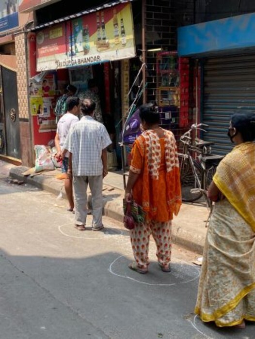 दुकानांबाहेर चौकोनी बॉक्स करून किंवा रांगोळीचे गोल आखण्यात आले. दोन चौकोनात एक ते दोन वीत अंतर सोडण्यात आलं आहे. या गोलामध्ये नागरिकांना उभं राहायला सांगितलं जात आहे.