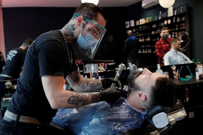 लॉकडाऊनमध्ये आणखी एक समस्या होती ते म्हणजे वाढलेल्या दाढी-केसांचं काय करायचं? त्या परिस्थितीत अनेकांनी घरच्या घरीच आपल्या हातात कात्री घेऊन एक्सपिरेमेंट्स केलं. मात्र जसे सलून खुले झाले तेव्हा सर्वजण तिथे पळाले. मात्र सलूनमध्येही कोरोनाचा धोका टाळण्यासाठी आवश्यक ती खबरदारी घेण्यात आली आहे. हे पॅरिसमधील बार्बर शॉप आहे. जिथं बार्बरने मास्क घातला आहे त्याशिवाय चेहऱ्यावर प्रोटेक्टिव्ह शीटही लावली आहे आणि हातात ग्लोव्हज घातले आहेत. (फोटो - रॉयटर्स)