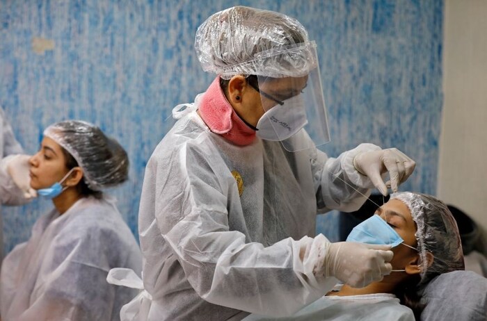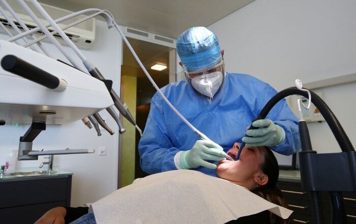 कोरोनाचा जास्त धोका हा डेन्टटिस्ट आहे. रुग्णांच्या थेट तोंडाशी त्यांचा संपर्क येतो. त्यामुळे डेटिन्स्टही आवश्यक ती खबरदारी घेऊन रुग्ण हाताळत आहेत. स्वित्झर्लंडमधील डेन्टटिस्ट लिओनार्ड ब्राझोलो रुग्णावर उपचार करताना. (फोटो - रॉयटर्स)
