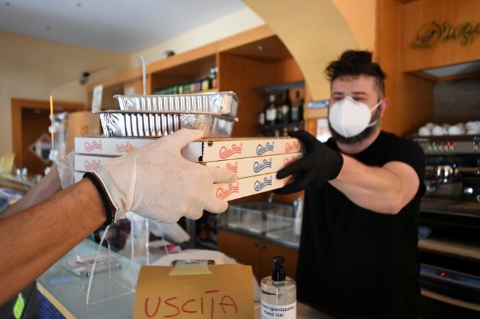काही देशांनी रेस्टॉरंट्ही खुली करण्यास परवानगी दिली आहे. मात्र अनेक रेस्टॉरंट्स फूड पॅक करून देत आहेत. इटलीतील रेस्टॉरंट मालक एका ग्राहकाला फूड पॅक करून देत आहेत. मात्र त्यावेळी विक्रेता आणि ग्राहक दोघांनीही आवश्यक ती खबरदारी घेतली आहे. मास्त, ग्लोव्हज घातले आहे. (फोटो - रॉयटर्स)