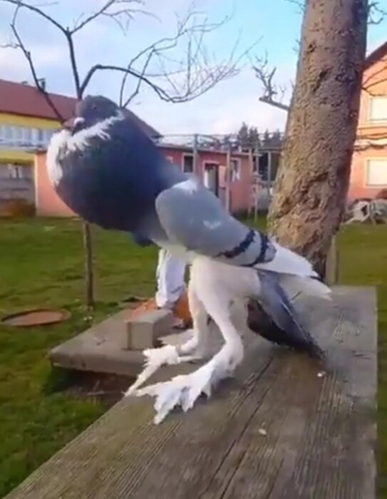 हा कबूतर लांब आहे. त्याच्या मानेकडील भागही फुगीर आहे. आश्चर्य म्हणजे या कबुतराचे पाय पांढरे आहेत आणि त्यावर पिसं दिसत आहेत.