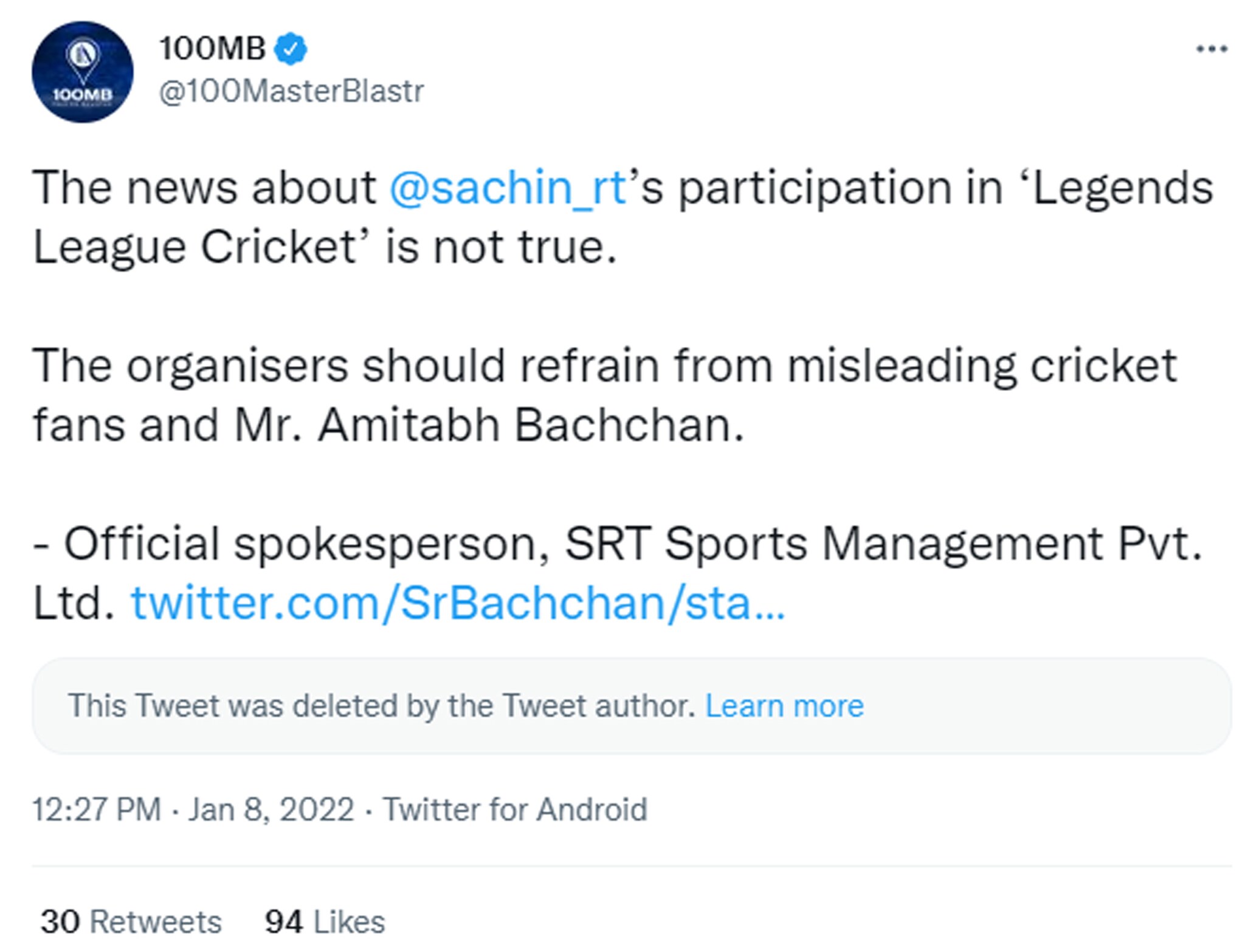 सचिन तेंडुलकर या स्पर्धेत खेळणार नाही. आयोजकांनी फॅन्स आणि अमिताभ बच्चन यांची दिशाभूल करणे टाळावे, असे स्पष्टीकरण 'एसआरटी स्पोर्ट्स' च्या अधिकृत प्रवक्त्याने दिले. (Twitter)