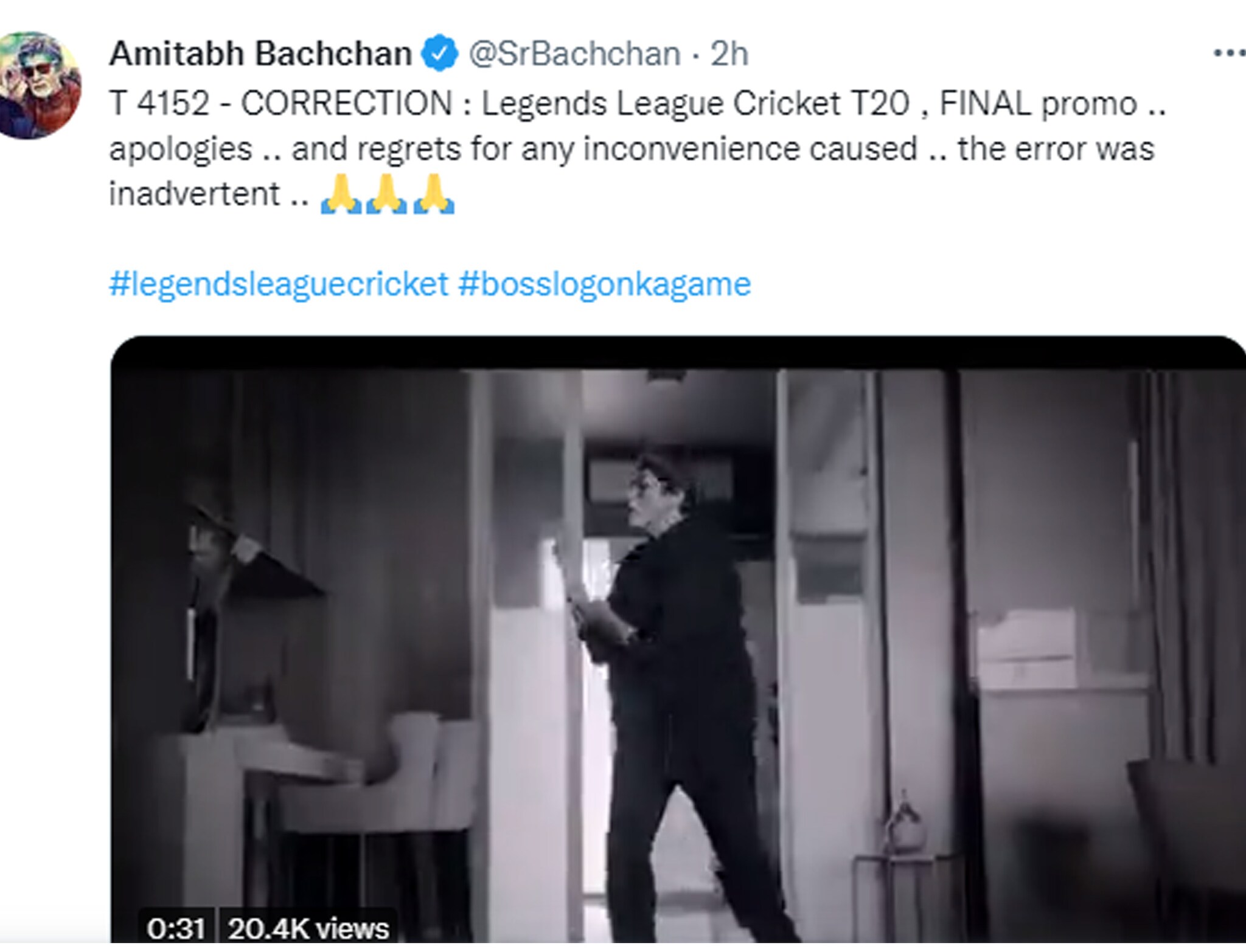 अमिताभ बच्चन यांनी नंतर नवा व्हिडीओ शेअर केला. 'लीजेंड्स लीग क्रिकेट 20' चा फायनल प्रोमो. कुणालाही त्रास झाला असेल तर माफी मागतो. ही अनावधानाने झालेली चूक होती,' असे ट्विट त्यांनी केले. (Twitter)