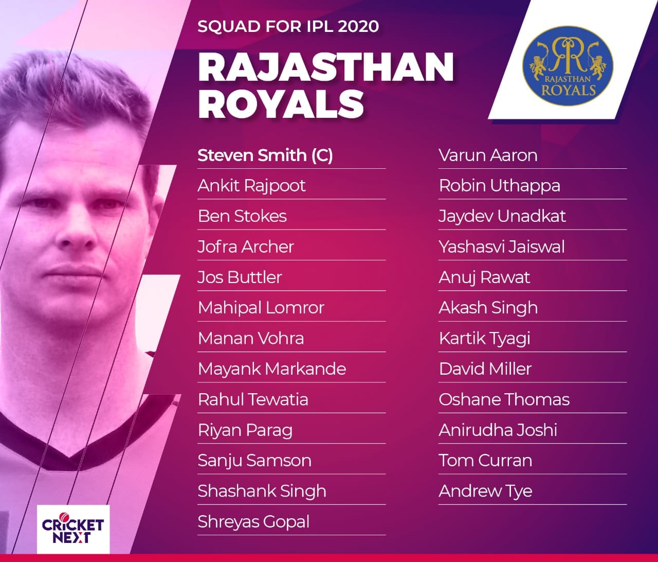 राजस्थान रॉयलची कमान हा स्टीव्ह स्मिथ सांभाळणार आहे. या टीममध्ये बेन स्टोक्स, जोस बटलर सारखे तडाखेबाज फलंदाज पाहण्यास मिळणार आहे