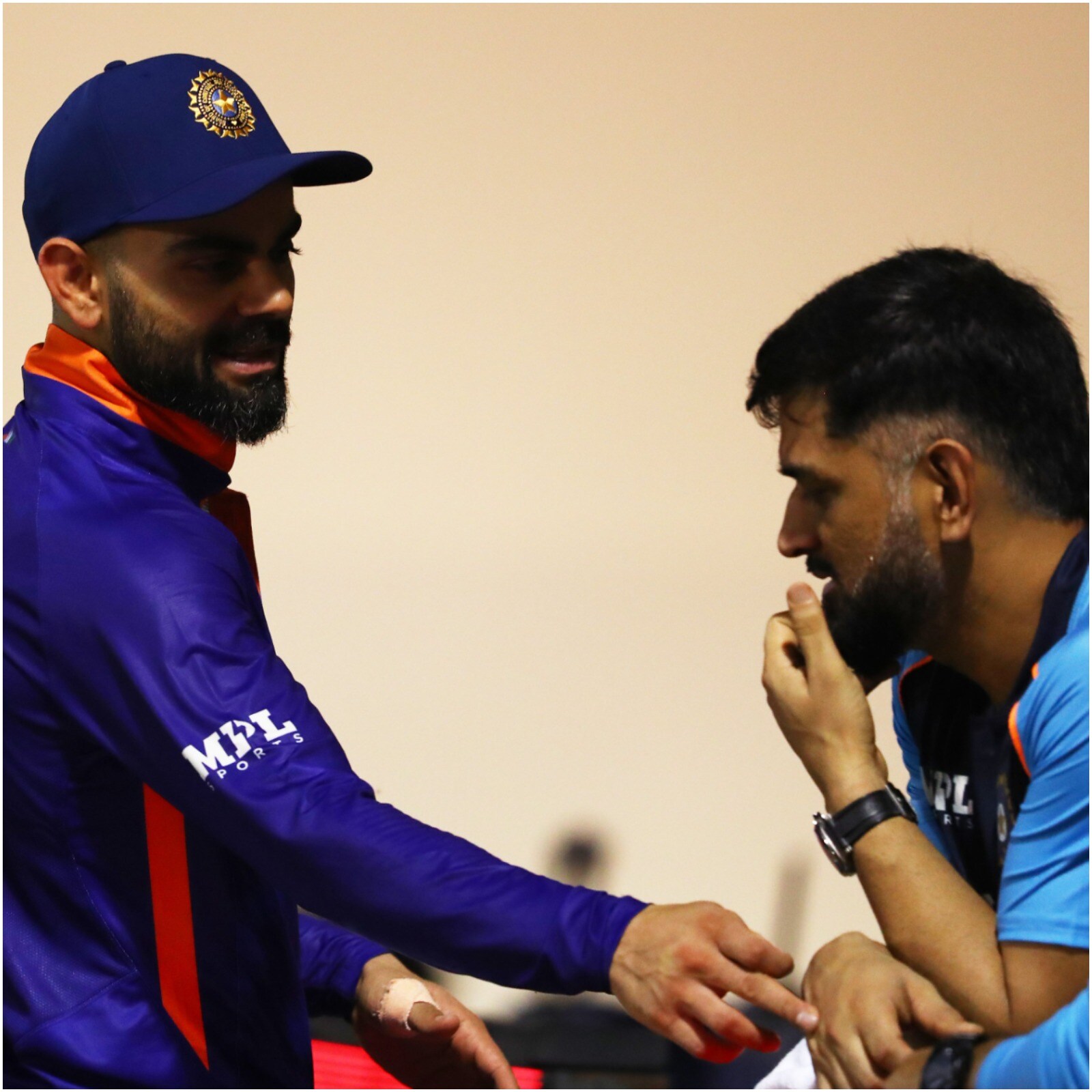 टी20 वर्ल्ड कपसाठी टीम इंडियाचा माजी कॅप्टन महेंद्रसिंह धोनीला (MS Dhoni) टीम इंडियाचा मेंटॉर बनवण्यात आलं आहे. पाकिस्तानच्या मॅचपूर्वी धोनीनं विराटचा क्लास घेतला. (PIC. AFP)