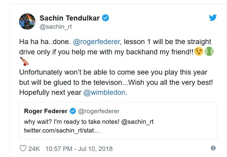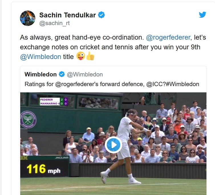 सचिनने ट्विटमध्ये फेडररला म्हटलं होतं की नजर आणि हालचालीचा जबरदस्त समन्वय साधत खेळला आहेस. विंम्बल्डन जिंकल्यावर आपण एकमेकांसोबत यावर चर्चा करू.