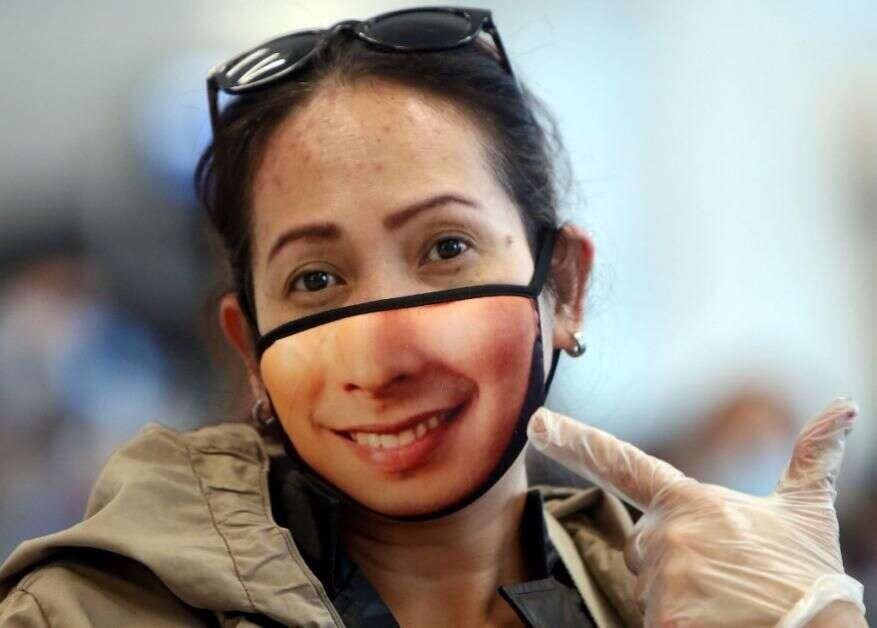 थायलंडच्या दक्षिणेकडील प्रांताच्या नारातीवाटमधील सकाळच्या मार्केटमध्ये सीफूड खरेदीसाठी आलेल्या महिलेनं कोरोनापासून बचाव करण्यासाठी घातलेला मास्क.