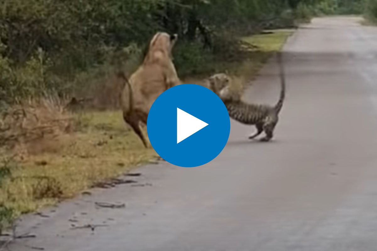 हा दुर्मिळ व्हिडिओ Kayla du Toit नावाच्या 18 वर्षीय विद्यार्थिनीने आपल्या कॅमेऱ्यात कैद केला आहे. आणि जीवनातील सर्वोत्तम आणि रोमांचक क्षणांपैकी एक प्रसंग असल्याचं वर्णन केलं. सिंहीणीच्या धमक्यासमोर बिबट्याने हार पत्करली तेव्हा तो राणीच्या हद्दीतून पळून जाताना दिसला. Youtube चॅनल LatestSightings.com वर हा व्हिडीओ शेअर करण्यात आला आहे.
